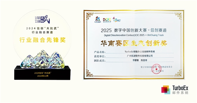 2025年,在中电标协举行的信创“大比武”金融专场赛事中,拓波软件TurboEx邮件系统项目组凭借凭借在云原生架构下领先的办公应用级电子邮箱解决方案荣获“行业融合先锋奖”,在数字中国创新大赛比赛中,TurboEx再次斩获信创赛道“生态创新奖”。