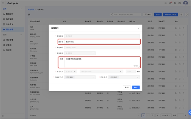 元数据管理:资产系统属性可自定义展示名和描述;