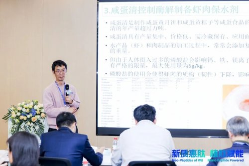 广东省特种酶工程技术研究中心主任崔春教授带来《酶促催化技术及在食品和化妆品中应用》主题分享。他通过沙棘蛋白肽、脱脂蛋黄肽、具备快速成膜抗皱功效的燕麦提取物等多个成功案例,生动展示了如何利用酶法将低值副产物转化为高附加值的功能性原料,并在食品和化妆品领域实现广泛应用,充分体现了技术驱动产业升级的巨大潜力。