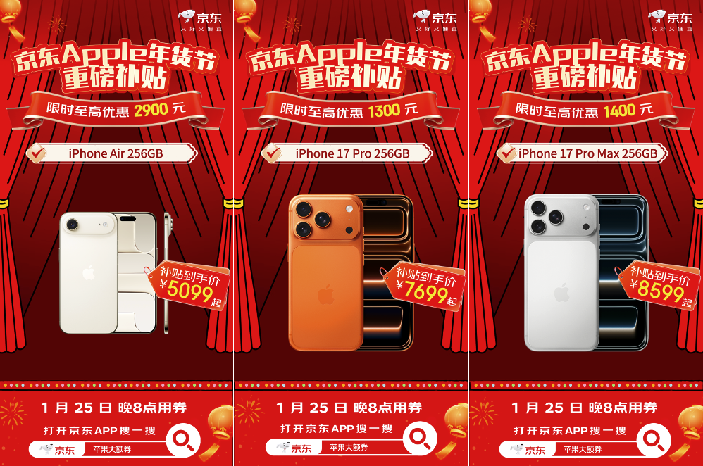 随着春节临近,数码产品迎来换新高峰。为满足消费者的换新需求,1月24日,京东Apple产品年货节全面开启,iPhone、iPad、Mac、Apple Watch等多品类均可参与活动。其中,指定iPhone 17可领500元国家补贴;iPhone 17 Pro系列指定机型叠加300元惊喜券和300元以旧换新券;iPhone Air指定机型可领2000元惊喜券、500元国家补贴、400元以旧换新补贴券,至高直降2900元。有换新计划的消费者,可立即打开京东APP搜索“苹果大额券”,一键直达活动会场抢先领取惊喜券,1月25日晚8点起即可使用。