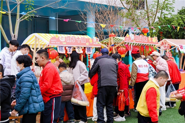 红灯笼、年货摊、新春贴画……阳江市江城区特殊教育学校的操场,在冬日的晨光中变成了一条热闹的“年货一条街”。红灯笼高挂,马年吉祥语贴纸随处可见,摊位上摆满了食品、用品和文创产品,一场特别的校园购物节在这里展开,它不仅是节日的庆祝,更是一堂真实生动的社会适应课。