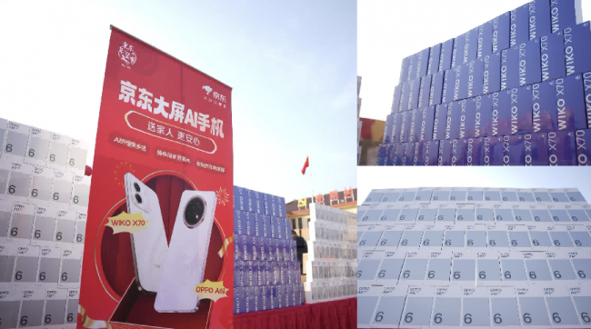 一排由崭新大屏AI手机堆叠而成的“手机墙”巍然矗立,成为了“我给老家送年货”光明村站最震撼的现场。1月29日,京东“我给老家送年货”活动首站江苏省宿迁市光明村正式发年货,最有排面的年货也随之诞生,京东为光明村家家户户准备的大屏AI手机垒起一面科技感十足的“手机墙”,成为了现场最具话题性的年货礼物。