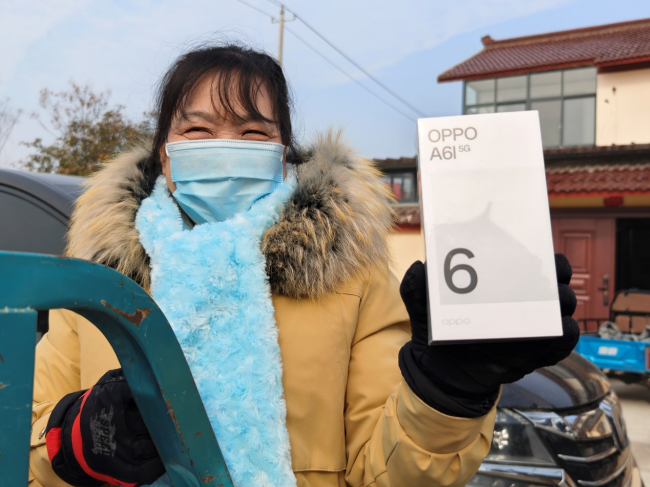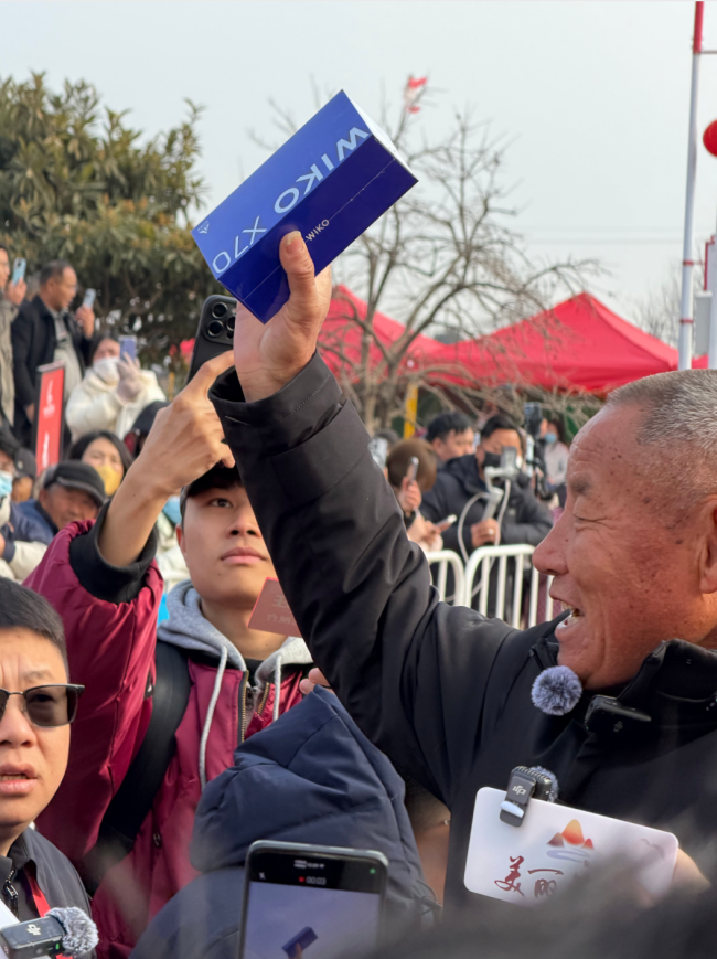 年货发放现场,人头攒动,热闹非凡,第一位领到手机的大爷脸上洋溢着笑容,高高举起新手机,兴奋地向大家展示。