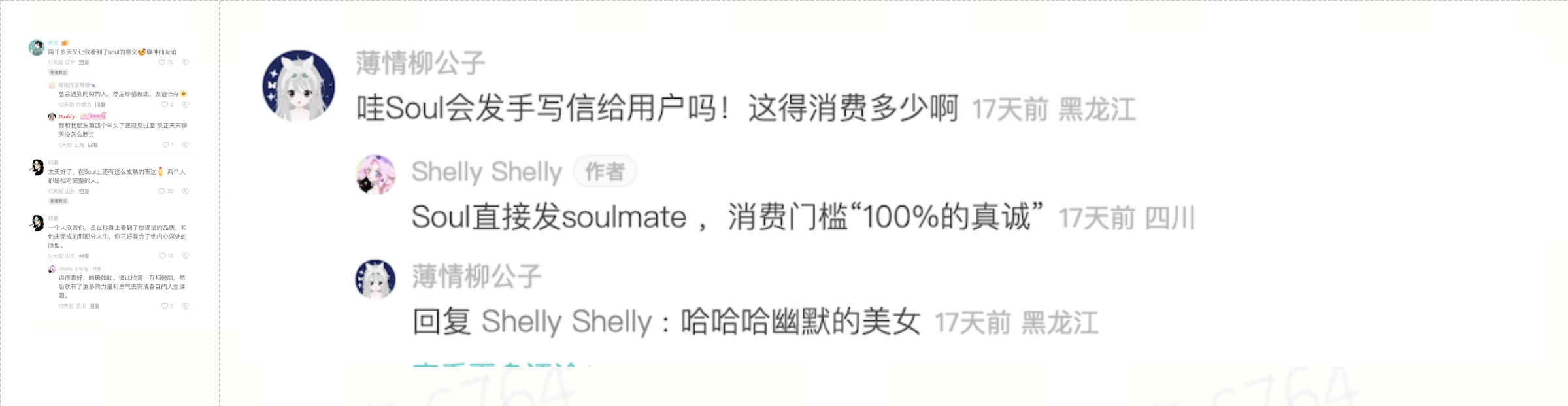 当 Shelly 将这封信拍成瞬间发出后,评论区迅速形成一个情感爆发的中心。四千多条点赞,三百多条评论,这些不仅是对一份友谊的祝福,更是一场对于情感奇观的见证,老用户们在感慨:“两千多天,又让我看到soul的意义,神仙友谊。”