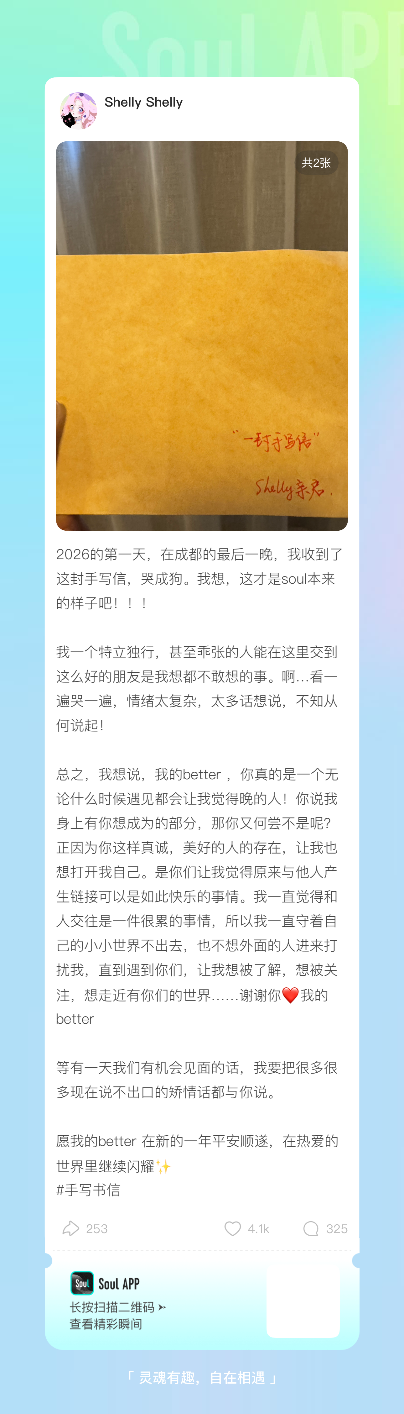 不过在 2026 年的元旦,Souler @Shelly Shelly 收到的新年祝福就很够意思——一封从几千公里外寄来的、跨越了经纬的手写信,来自她的 Souler 好友@一只火龙果, “展信佳,见字如面”,开头便有老派社交的热烈与郑重。