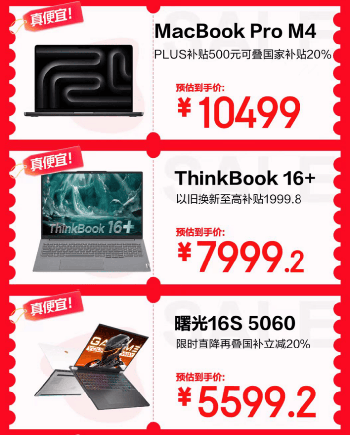 专业创作领域同样惊喜不断。MacBook Pro M4凭借其Liquid视网膜XDR屏,为摄影、视频剪辑提供精准色彩表现,10499元起售。ThinkBook 16+,搭载RTX 5060显卡与3.2K 165Hz创作者屏幕,性能出色,覆盖平面设计、3D建模全场景。机械师曙光16S则搭载满血版RTX 5060与高刷高分辨率屏幕,为视频渲染与工程建模提供强劲动力,优惠后预估5599.2元。