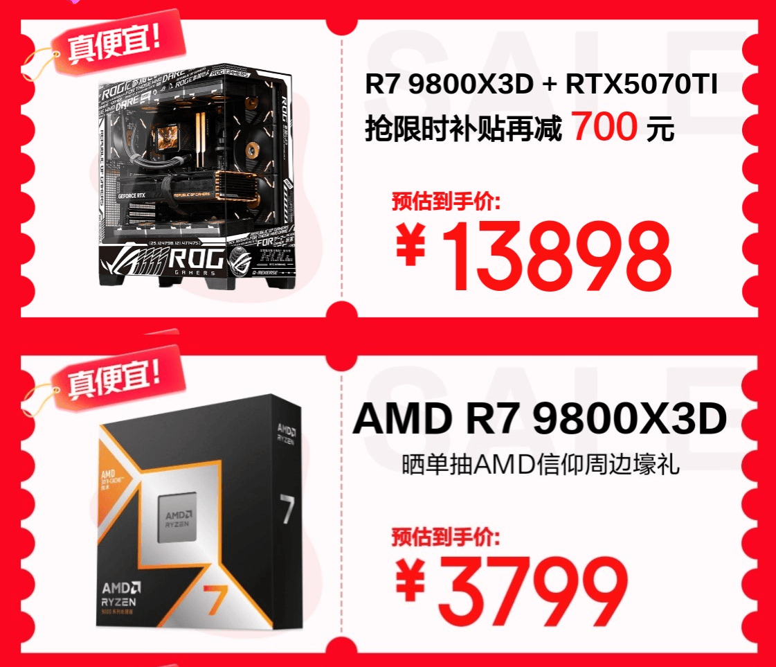 对于游戏玩家和创作者来说,高配装机选择R7 9800X3D处理器搭配RTX5070Ti显卡堪称经典。京东用户下单可抢700元限时补贴,预估到手价13898元。AMD R7 9800X3D采用Zen5架构,8核16线程,其高频设计能显著提升游戏渲染、多任务处理和高负载应用的响应速度与稳定性。而RTX5070Ti作为一款旗舰级显卡,对比前代性能大幅提升,先进的Blackwell GB203-300架构为其带来强劲的AI算力加持,即使畅玩3A大作也能游刃有余,轻松满足高画质需求。另外,若单独购买R7 9800X3D处理器到手价3799元,同时可享AMD信仰周边好礼。