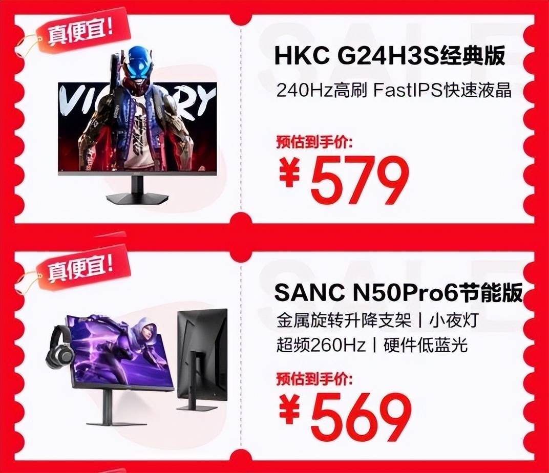 更有诸多百元级装机实用好物迎来超值价。其中,HKC G24H3S经典版作为一款高性价比入门显示器,在日常办公、轻度游戏和娱乐观影场景下均能稳定输出,画面色彩还原自然、久看不累且无色偏,舒适度表现优异,适合长时间使用。另一款 SANC N50Pro6节能版支持原生240Hz高刷新率,采用专属节能技术显著降低功耗。同时,它还即享硬件级低蓝光护眼,配备屏下小夜灯、距离感应器提供实时贴心守护。