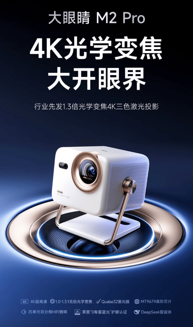 Vidda大眼睛M2 Pro作为行业首款1.3倍光学变焦三色激光4K投影仪,完美解决了小空间大画面的难题。无论是都市公寓的卧室还是书房,都能轻松投射百寸巨幕。其搭载的万元级MT9679芯片和四单元双分频HIFI音响系统,让每一次观影都如同置身专业影院。6月4日-6日限时抢购,叠加国家补贴后仅需3679元,还赠送EPP便携收纳箱和视频VIP月卡,更有机会抽中1099元幕布。对于追求品质生活的用户,无疑是打造私人影院的最佳选择。