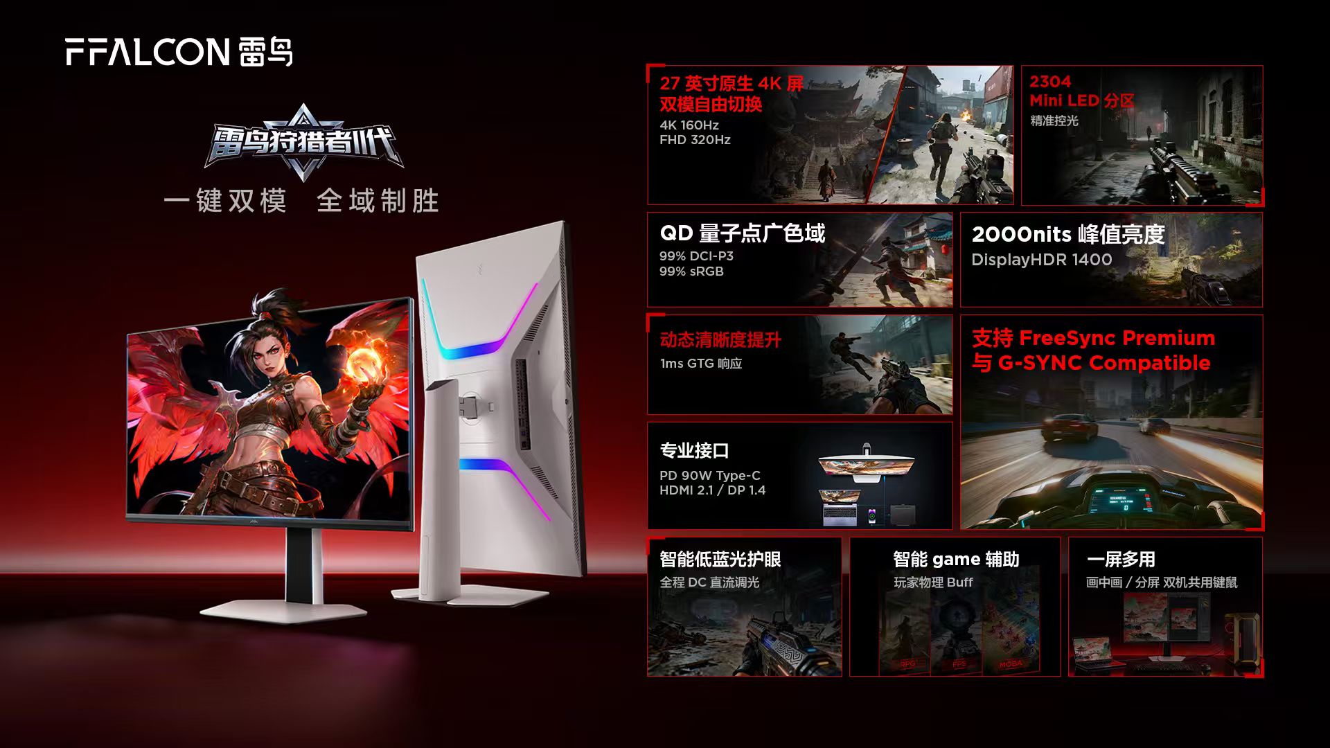 雷鸟狩猎者系列定位全能型准旗舰,凭借 “双模4K” 创新设计,可在 4K 160Hz 高画质 与 FHD 320Hz 高刷新率 之间一键切换,一次性解决“画质与流畅不可兼得”的玩家痛点。4K 模式下,依托 QD-MiniLED 分区控光与量子点广色域,能细腻呈现3A大作的场景细节与影视内容的暗场层次,并满足专业创作的色彩精准需求;切换至 FHD@320Hz 模式后,屏幕则转为高刷电竞装备,配合极速响应与低拖影表现,轻松应对 FPS、竞速等游戏的轻度竞技场景,真正实现 “一屏全能,全场景适配”。