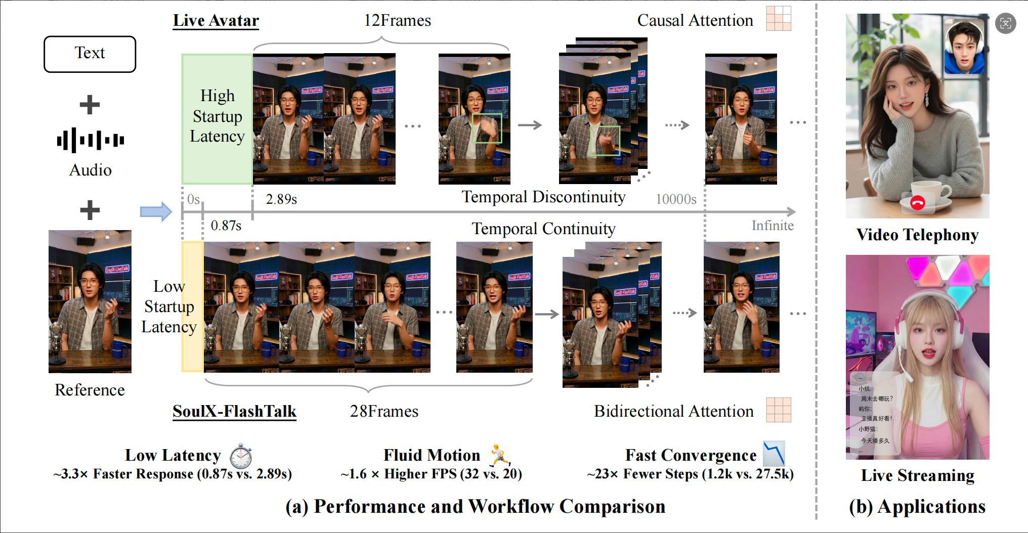 •超长视频,稳定生成: 不同于传统的单向依赖,SoulX-FlashTalk 完全保留了双向注意力机制,让每一帧生成都能同时参考过去与隐含的未来上下文,从根本上压制身份漂移,这意味着在超长直播中,主播的口型、面部细节和背景环境将始终保持一致,不会出现模糊或变形。