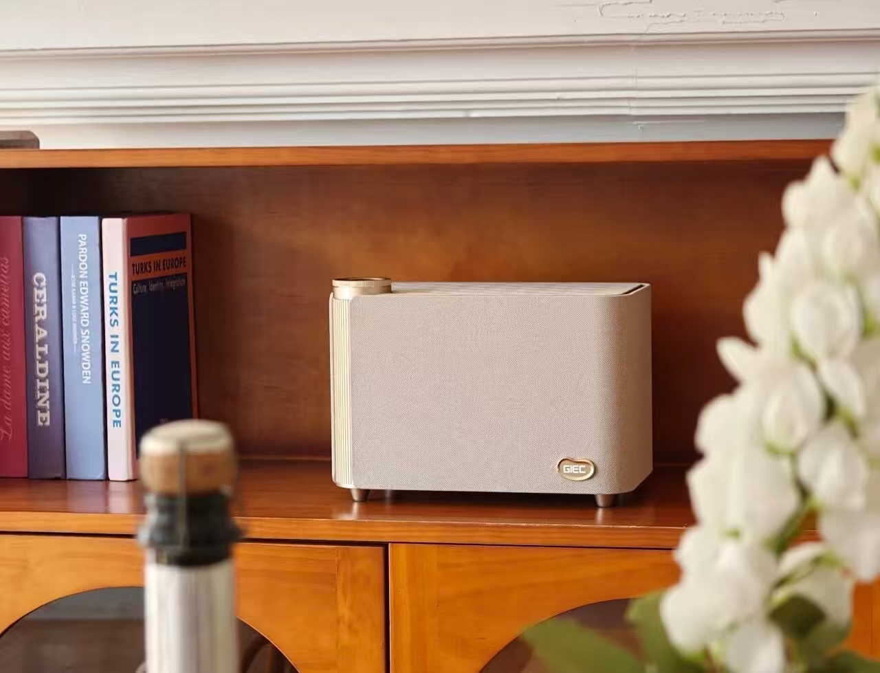 3、杰科Q20 “小圆满”:全球首款圆饼包型Wi-Fi便携风尚音箱,融合奢品美学与母带音质