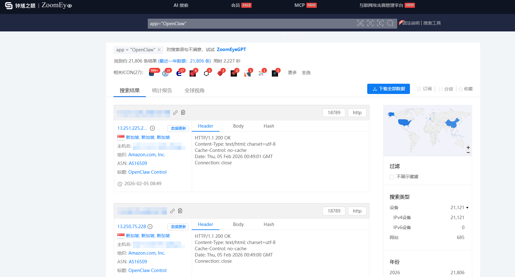 借助 ZoomEye 测绘平台与知道创宇安全智脑平台,我们将部署了 OpenClaw 的 IP 与知道创宇安全智脑平台捕获的 IP 进行交叉分析,得到了一批有明显攻击行为的异常 IP。