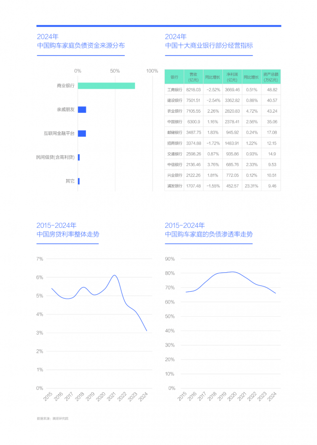 2024年,中国购车家庭的负债资金主要来源于商业银行,所占比例已超过76%;其次为亲戚朋友、互联网金融平台,二者占比均仅为10%左右,与商业银行相比差距显著。若银行能持续优化业务结构,降低住房贷款比重,购车家庭的负债压力有望进一步减轻。