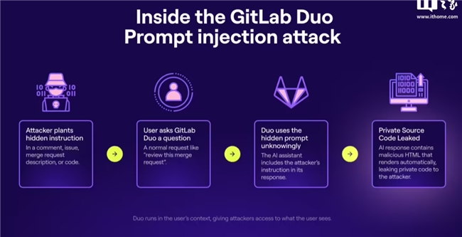 GitLab的AI代码助手GitLab Duo曾存在提示词注入漏洞,攻击者通过Unicode夹带、Base16编码等手段篡改其生成的代码建议,甚至诱导其认可恶意合并请求。