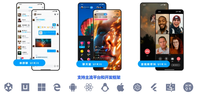 开发者核心诉求是降低集成难度、提升效率,环信从多维度实现这一目标。开发者基于SDK、UIKit、CallKit能快速构建单聊、群聊、聊天室、音视频等基础通讯服务。环信UIKit提供各类通用UI组件,开发者可直接复用自定义;配套全场景Demo,关键代码可移植,大幅减少工作量。环信已实现全平台SDK全覆盖,支持iOS、Android、Web、Windows、macOS及鸿蒙原生开发,适配React Native、Flutter等跨平台框架,还提供小程序/H5专用SDK,服务端开放Rest API与Webhook,真正实现一次开发、多端部署。与声网深度融合的“IM+RTC”一站式集成服务,1天即可完成带有聊天和音视频功能的需求开发。