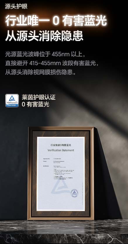 尤为关键的是护眼能力。对于120寸这样的超大屏,护眼不是附加项,而是刚需——屏幕越大,若采用直射光源,眼睛负担呈指数级增长。海信激光电视星光S1纯享版是当前行业唯一获得德国莱茵0有害蓝光认证的产品,从光源端规避415–455nm高能短波蓝光,实现“0有害蓝光”,此外,配合0眩光、0反光、0频闪、0屏幕辐射的技术优势,做到真正的全方位大屏护眼。协和医院实验证实,长时间观看后泪膜稳定性显著优于液晶电视。