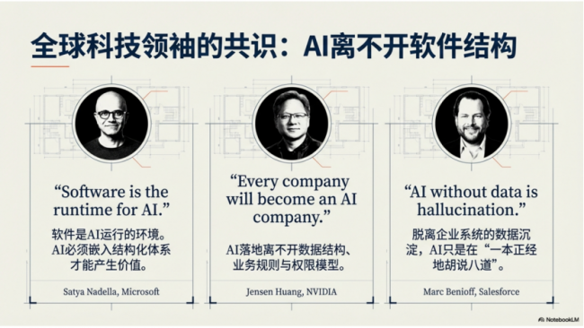 微软CEO Satya Nadella有句分量极重的话:“Software is the runtime for AI.(软件,是AI运行的环境)”。这句话戳破了“AI万能论”:AI不是漂浮的能力,它必须嵌入结构化的软件体系,才能落地产生价值——就像APP必须跑在手机系统里,否则只是一堆无用代码。
