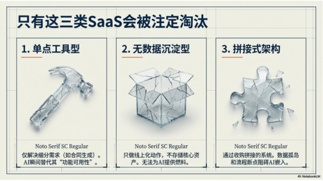 必须承认,AI时代会有SaaS被淘汰,但被淘汰的不是赛道,而是三类没有结构壁垒的产品——它们的核心缺陷,正是AI最擅长替代的领域。