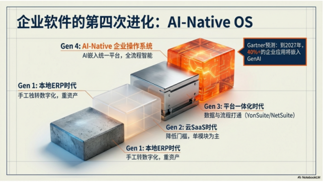 第一代是本地ERP时代(用友NC、SAP、Oracle等),解决了企业从手工记账到数智化的基础需求,但太重太贵,仅服务超大型企业;