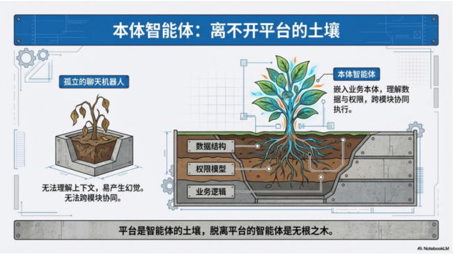 企业AI的真正形态,从来不是孤立的聊天机器人,而是“本体智能体”——它的核心是嵌入业务本体、理解数据结构、具备权限认知、跨模块协同执行,是能真正干活的“数智员工”,而非只会聊天的工具。