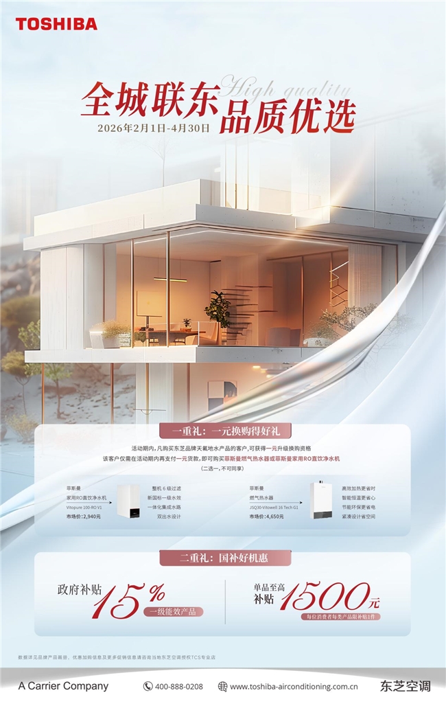 金三银四装修旺季,选空调更要抓住时机。看完东芝XIAOZHI家用中央空调的控温实力、人性化体验与全生命周期服务,相信大家对“东芝空调怎么样”已经有了清晰的答案。现在东芝空调还推出“全城联东品质优选”活动,2026年2月1日-4月30日期间,购买东芝空调品牌的天氟地水产品,可享1元换购菲斯曼燃气热水器或家用RO直饮净水机,一级能效产品还可享15%政府补贴,单品至高补贴1500元,东芝XIAOZHI家用中央空调就属于一级能效的空调,准备买空调的朋友可以趁优惠入手,让品质与实惠兼得,为新家开启舒适生活。