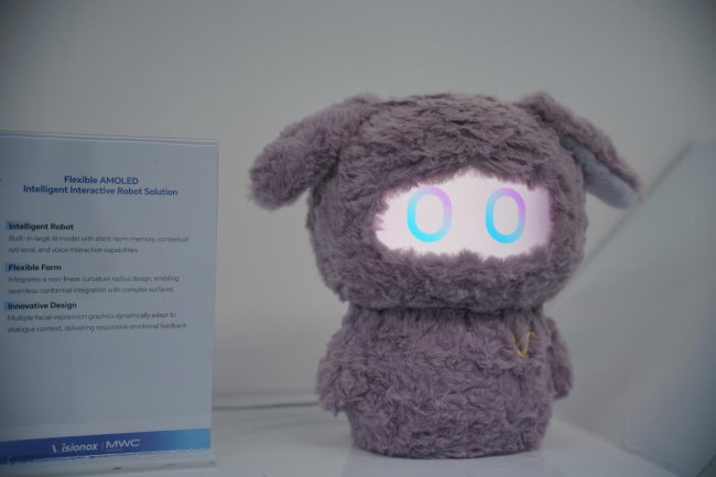 维信诺展示的柔性AMOLED智能交互机器人,搭载6.7英寸柔性AMOLED屏幕,轻拍头部即可唤醒;交流过程中,“面部”可呈现微笑、眨眼、好奇等拟人化表情;即使在AOD息屏状态下,也能维持基础表情,实现安静陪伴。屏幕从被观看走向可交流,成为连接用户与智能系统的情感入口。