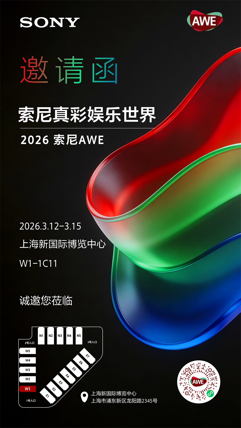 2026年3月12-15日,AWE 2026中国家电及消费电子博览会将在上海启幕,索尼将同时参展双馆,以「索尼真彩娱乐世界」为主题重磅亮相上海新国际博览中心主会场(W1-1C11),同步在东方枢纽国际商务合作区分会场拓展全场景娱乐体验。
