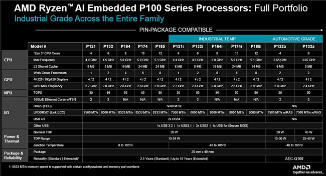 为了满足这些需求,AMD 正扩展其 AMD 锐龙(Ryzen™)AI 嵌入式 P100 系列处理器产品组合。与此前发布的采用相同紧凑型球栅阵列(BGA)封装的 P100 系列处理器相比,新款处理器可提供最高 2 倍的 CPU 核心数量、最高 8 倍的图形处理单元(GPU)算力,且系统级每秒万亿次运算(TOPS)性能预计提升 36%。①