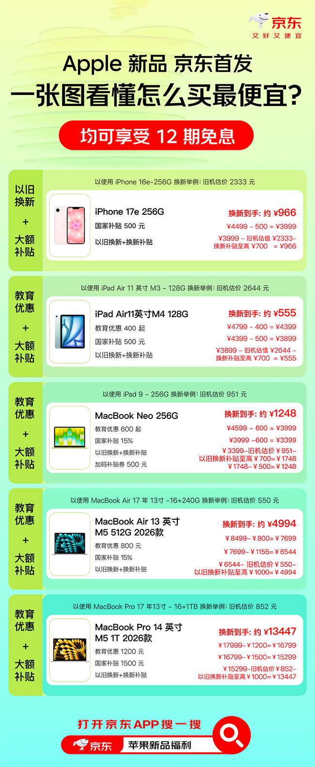 从入门级MacBook Neo、iPhone 17e到专业级MacBook Pro,苹果春季新品满足消费者多元化需求,京东现货开售搭配“小时达”极速配送,以及丰富的补贴组合,助力消费者轻松焕新。3月11日登录京东App搜索“苹果新品福利”锁定专属优惠,体验苹果新品魅力先人一步。