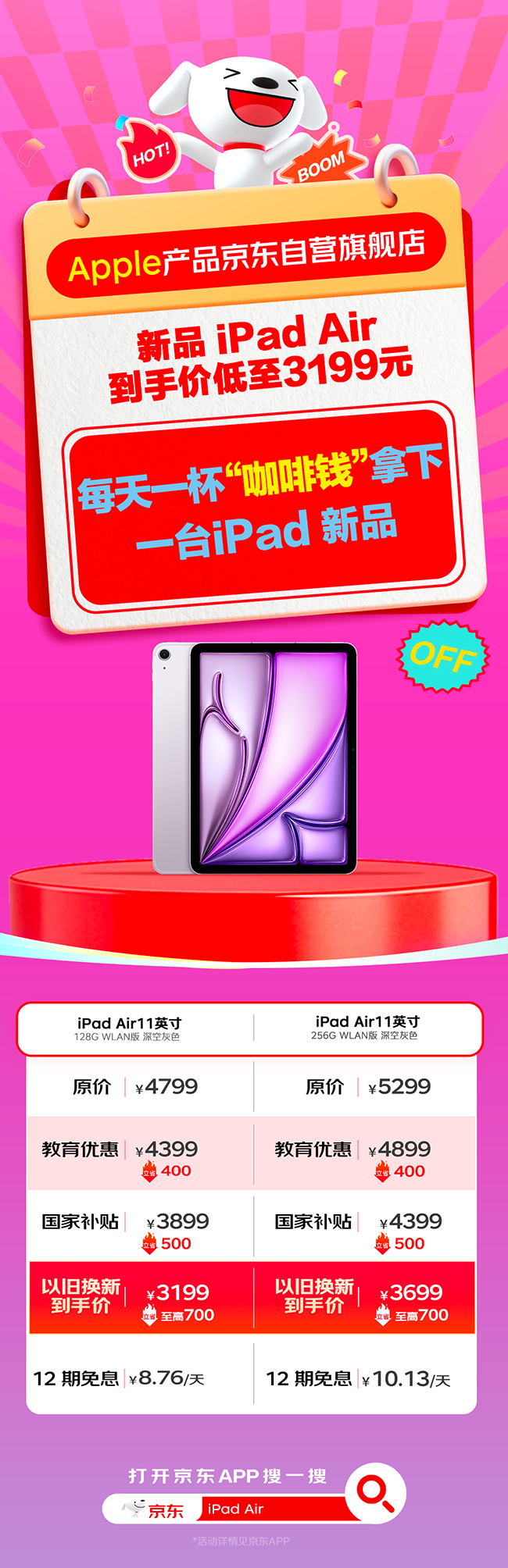 2026款iPad Air搭载性能强劲的M4芯片,支持妙控键盘与Apple Pencil Pro,兼顾创意工作与移动办公需求。起售价4799元,京东同步推出12期免息、国家补贴立减15%,以旧换新补贴300元,学生群体还可叠加400元起教育优惠,到手价低至3199元起。
