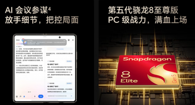 荣耀Magic V6搭载MagicOS 10,带来AI智能提醒、AI会议纪要、多语言实时转写、YOYO拍照转文档功能,工作学习省时省力;支持荣耀AI互联,畅联苹果生态;支持超流畅三分屏,Vulkan图形引擎结合多任务统一渲染技术,多窗口同步流畅运转。
