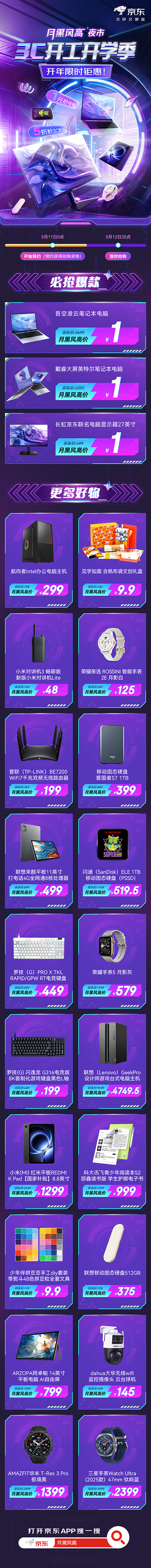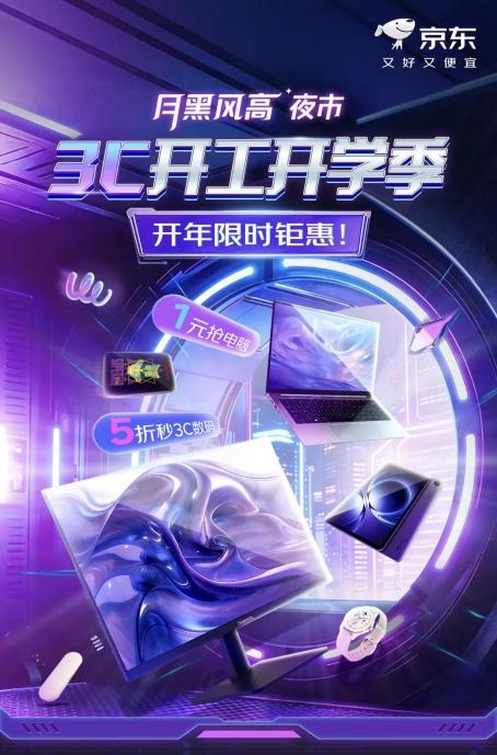 3月12日晚8点,京东月黑风高夜市3C开工开学季开启限时钜惠活动。不仅有1元抢电脑的超值福利,还能5折秒杀多款3C数码好物,多款笔记本电脑、显示器及数码周边产品将以超低价格集中放送,无论是学生党想要升级学习装备,还是职场人想给自己添点生产力,打开京东搜索“月黑风高”,即可在这场夜市中找到专属惊喜。