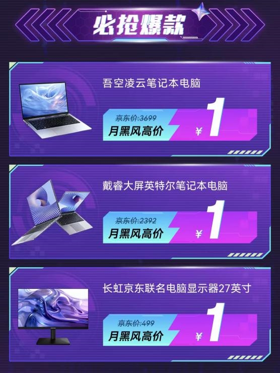 笔记本电脑的性能和显示效果直接影响到工作效率与学习体验。本次夜市活动最超值的三款1元秒杀单品,直击用户对高性价比数码设备的渴求。吾空凌云笔记本电脑以1元月黑风高价亮相,不仅能够流畅运行Office办公软件,还具备良好的多任务处理能力,无论是学生撰写论文、制作PPT,还是职场人日常文档处理、视频会议,都能提供稳定可靠的性能支撑。同样以1元开抢的戴睿大屏英特尔笔记本电脑,则针对长时间使用电脑的用户痛点,采用大尺寸超清护眼屏设计,不仅提升了视觉沉浸感,更有效缓解了连续用眼疲劳。此外,长虹京东联名27英寸电脑显示器也加入1元秒杀阵营,作为桌面显示器升级的理想选择,其27英寸大屏配合1080P全高清分辨率,无论是修图设计、追剧观影还是日常办公。都能呈现细腻真实、层次丰富的视觉效果,带来更沉浸、专业的显示体验。