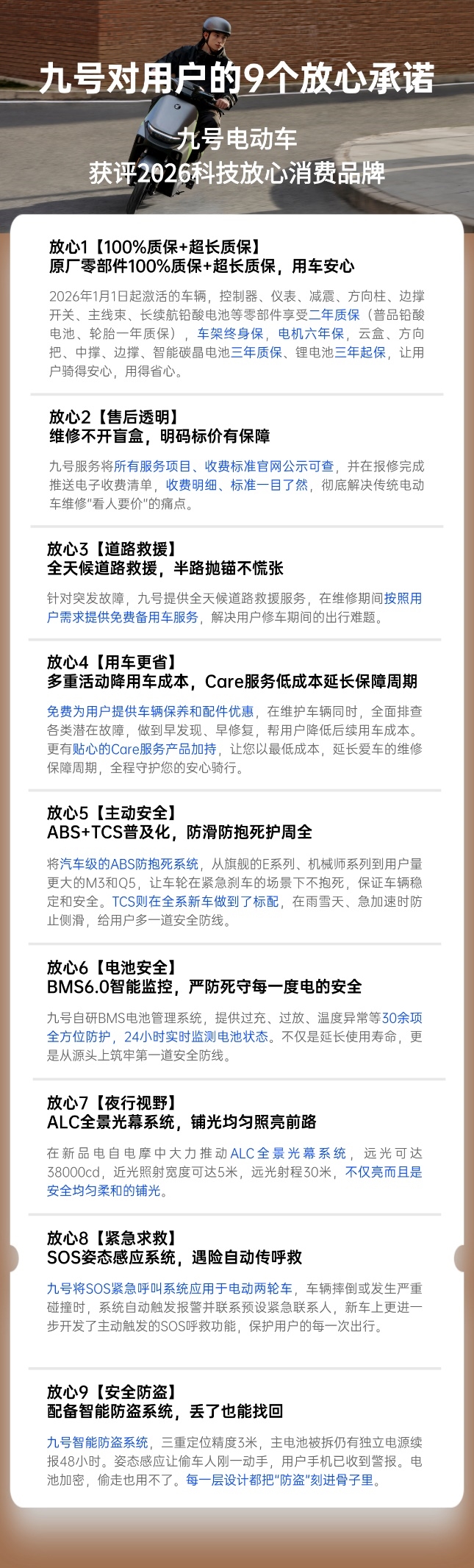 3月14-15日,在深圳人才公园举办的2026“FUN心消费节”上,九号电动车凭借过硬的产品安全技术和标准化贴心服务,获得“2026科技放心消费品牌”称号。同时,九号针对广大的用户,正式发布“9个放心”承诺。