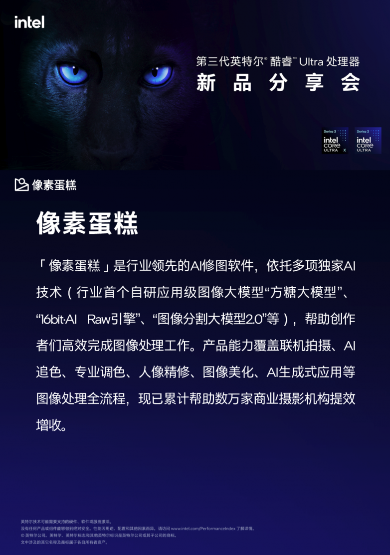 近日,在第三代英特尔®酷睿™Ultra处理器新品分享会上,像素蛋糕作为图像软件赛道唯一受邀的专业AI修图应用正式亮相。此次亮相不仅标志着像素蛋糕加入Intel硬件生态,更宣布已完成与Intel最新芯片的优化适配,为全球摄影师及修图师带来了“即拍、即修、即交付”的无缝工作流体验。