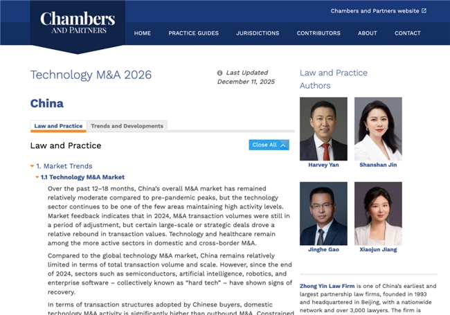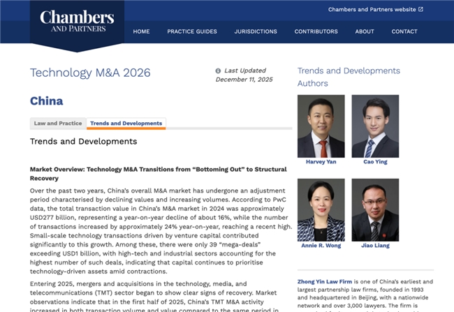 近日,国际权威法律研究与评级机构钱伯斯(Chambers and Partners)发布《Chambers Global Practice Guides:Technology M&A 2026》中国章节(最后更新日期:2025年12月11日)。中银律师事务所受邀担任该章节作者团队,分别就“Law and Practice(法律与实务)”及“Trends and Developments(趋势与发展)”两大板块提供系统解读与实践指引,聚焦半导体、人工智能、工业软件、数据基础设施、新能源与先进制造等关键赛道,全面呈现中国科技并购市场的结构性变化、监管导向与交易执行要点,进一步体现本所在科技并购与跨境交易领域的专业积淀与行业影响力。