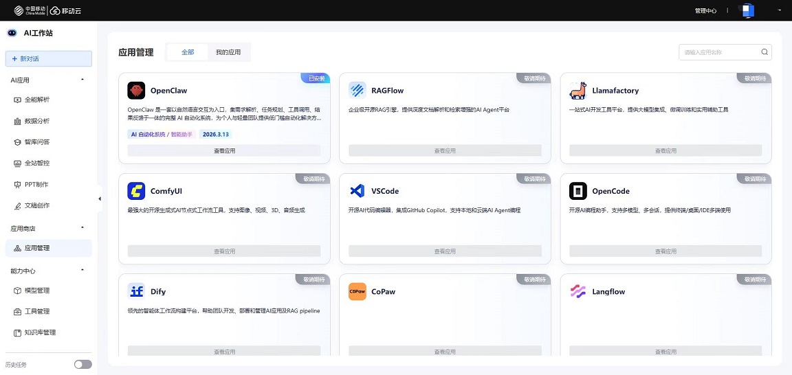 除了OpenClaw之外,移动云AI工作站(智惠版)更是把智库问答、智能写作、PPT制作、全能解析、数据分析、全站智控等高频AI能力打包到位,不用额外下载、不用逐个调试,白屏化操作简单易懂,零基础也能快速上手。