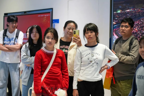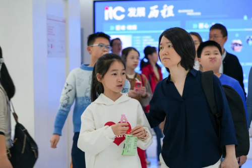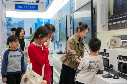 亲子家庭有序走进itc智慧展厅,首先映入眼帘的是产品展示长廊,大家在这里驻足观看企业科普动画,深入了解企业的发展历程、品牌文化,以及音视频产业的创新历程与辉煌成就。