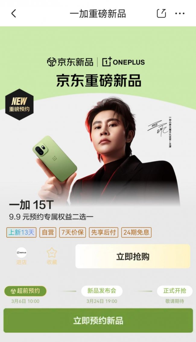 3月24日,一加 15T将正式发布。为带给消费者更多权益,京东携手一加打造先人一步加速换新计划,提供限量新品现货优先发货,购指定版本限量赠1000份京东PLUS会员年卡。即日起,消费者可到京东APP预约新机,方便发布会后第一时间下单。