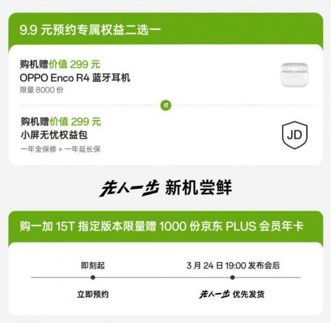来京东预约一加 15T,0元预约赢新机,9.9元预约享专属权益二选一,包括限量价值299元OPPO Enco R4蓝牙耳机、价值299元小屏无忧权益包(一年全保修+一年延长保)。此外,来京东下单一加 15T,部分地区享国补立减15%,还可享24期免息、以旧换新至高补贴1200元、赠价值119元原厂后盖保一年、直播间限量赠价值129元OPPO 20W移动电源、学生限量赠价值129元一加极木随行杯、晒单赢50元京豆、赠价值2200元新机权益礼包、加199元享限量80%京东保值换新、原厂碎屏保买一年送一年、部分新品配件30元优惠等福利。