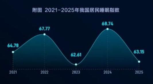 近年来,我国居民睡眠状况呈现出复杂的变化趋势。2025年,睡眠质量指数为63.15分,整体睡眠状况有所改善。然而,从长期来看,睡眠质量指数自2021年的64.78分下降至2025年的63.15分,反映出睡眠质量仍面临一定挑战。
