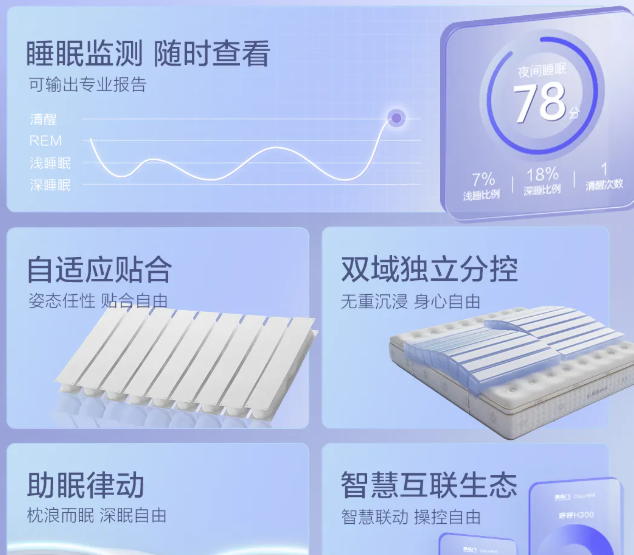 呼呼以一整套基于中国人体征的大数据算法、前沿的多模态大模型以及医疗级的高精度监测技术为底座,形成“自适应承托系统、双域独立分控技术、律动按摩系统、智能互联生态”四大核心技术矩阵。具体来看,自适应承托系统可通过AI算法芯片、柔性传感带、专利条形气囊阵列的精密协同迅速完成调整,让床垫适应人;双域独立分控技术可实现左右两侧床垫独立调节,双人睡眠互不干扰;律动按摩系统提供多种精细化按摩功能;智能互联生态支持OTA在线升级,不需更换床垫就能解锁未来新的睡眠模式、按摩程序以及智能联动功能。