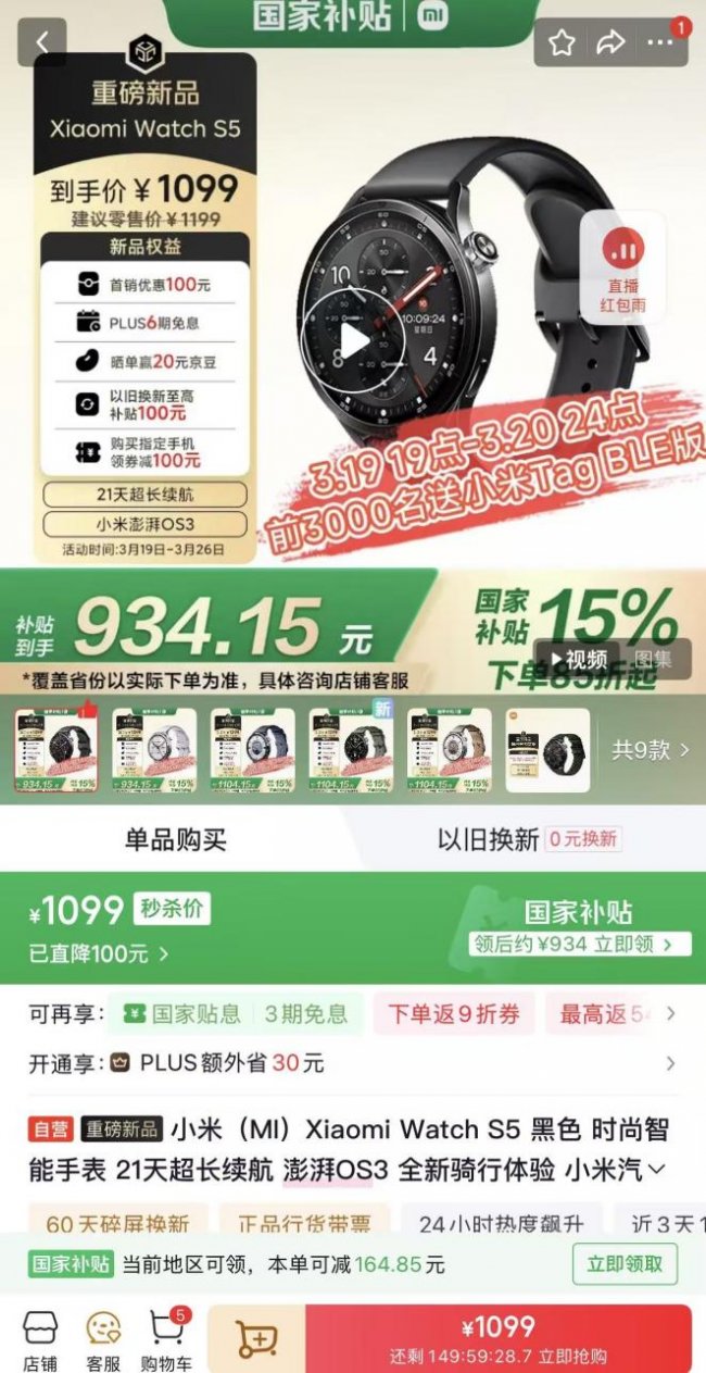 3月20日,小米正式发布新一代智能穿戴旗舰——小米 Watch S5。新品在延续经典设计语言的基础上,围绕外观工艺、运动健康监测与生态互联体验实现多维升级,进一步强化专业化与智能化能力,为用户带来更系统、更高效的健康管理体验。目前,小米 Watch S5已在京东开启抢购,叠加国家补贴15%,下单享85折优惠,补贴后到手价低至934.15元。用户打开京东APP搜索“小米 Watch S5”,即可一键解锁全新腕上科技体验。