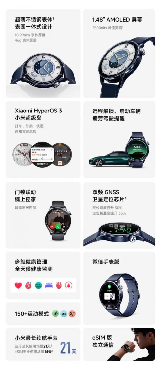 作为小米智能穿戴的最新力作,小米Watch S5在多项核心功能上实现突破。外观方面,产品采用超窄表圈搭配高质感不锈钢中框,视觉上更加精致,并提供陶瓷、锻造碳等多种高端材质版本,兼顾品质感与个性化选择。运动健康监测能力进一步强化:心率传感器由双灯组6PD升级为四灯组4PD,配合心率算法2.0,心率测量准确率提升至98.4%;睡眠算法同步升级,新增“睡眠趋势报告”,帮助用户系统了解自身睡眠状况。针对户外场景,产品升级GNSS定位系统,并支持离线地图导航与Wi-Fi快传,提升脱离手机后的独立运动体验。在小米澎湃OS 3的加持下,新品带来超级岛焦点通知、高斯模糊视觉效果、双手模式等全新交互体验,并支持多设备互联与运动Vlog录制,打造更加智能、流畅的全场景穿戴体验。