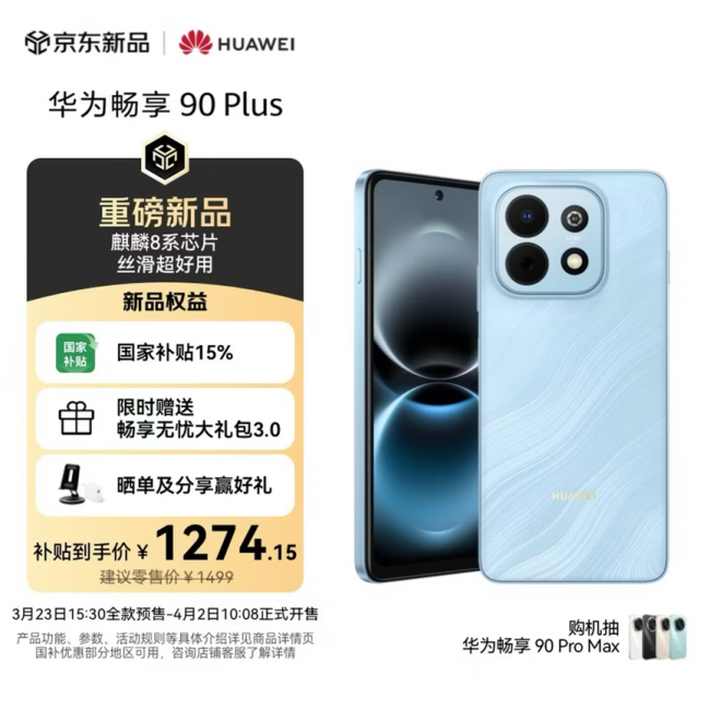 3月23日,华为在春季全场景新品发布会上推出畅享90系列和华为Mate 80 Pro Max风驰,其中畅享90系列,包含标准版、Plus和Pro Max三款机型。价格方面,华为畅享90系列起售价1299元,华为Mate 80 Pro Max风驰版起售价8499元。目前,以上机型已在京东开启预售,华为畅享90 Plus和Pro Max机型将于4月2日10:08开售,标准版将于4月23日10:08开售,华为Mate 80 Pro Max风驰版3月27日10:08开售。为帮助用户更轻松换新机,针对华为畅享90 Plus、Pro Max,京东推出了6期免息、以旧换新至高补贴500元、一年只换不修服务,还可叠加国家补贴15%使用,进一步降低购机门槛。此外,京东PLUS会员购买华为 Mate 80 Pro Max风驰版,还可享180天“只换不修”专属保障。