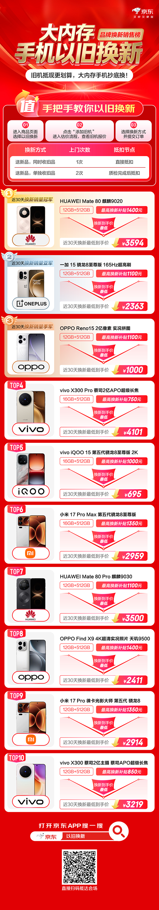 此外,京东推出大内存手机以旧换新销售榜,纠结买哪款手机的消费者可以跟着该榜单下单,一次性了解近30天换新销量TOP10的手机产品,享低价换新。其中,华为Mate 80斩获近30天换新销量冠军,12GB+512GB近30天换新最低到手价3594元;一加 15斩获近30天换新销量亚军,12GB+512GB近30天换新最低到手价2363元;OPPO Reno15斩获近30天换新销量季军,12GB+512GB近30天换新最低到手价1000元。