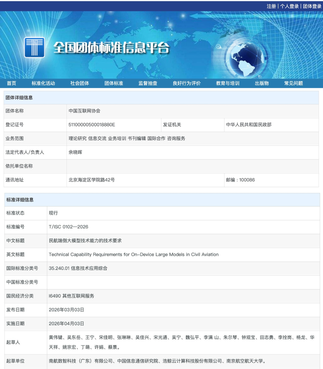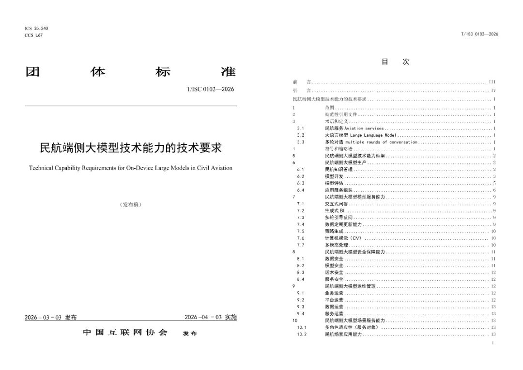 近日,由南航数科、中国信通院、浩鲸科技与南京航空航天大学等联合起草的《民航端侧大模型技术能力的技术要求》(T/ISC 0102-2026)团体标准,获中国互联网协会认证发布。