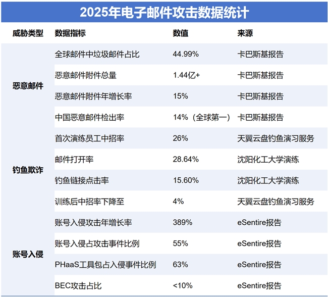 邮件系统作为政企核心通信载体,正面临日益严峻的安全威胁。根据2025年各项电子邮件调研报告与真实攻防演练数据,钓鱼欺诈、僵尸网络滥发、渗透入侵已成为企业邮件安全的三大“杀手”: