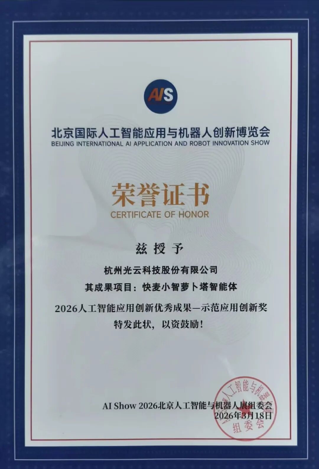 经过前期从技术创新性、应用实践性、产业可推广性、示范引领性等维度严格遴选,光云科技旗下“快麦小智萝卜塔智能体”在本次大会荣获“2026人工智能应用创新优秀成果·示范应用创新奖”。多年来,快麦小智推动AI技术在电商客服行业应用,努力和成绩再次得到认可。